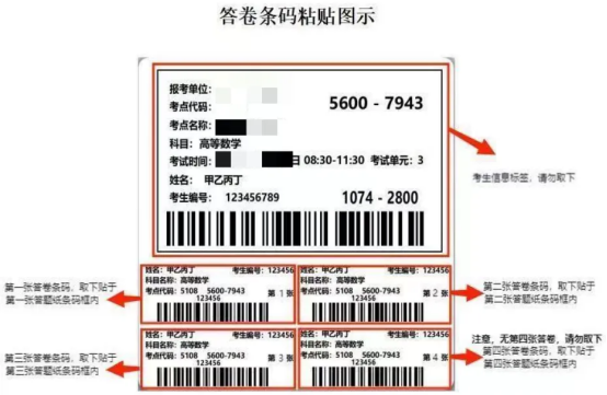 凡报考我校2026级硕士研究生的考生,自命题试题袋信封正面左下角将会有如下图所示标签。标签共由两部分组成:1.考生信息标签;2.考生答题纸条形码(共4张)。考生需按图示正确粘贴答卷条形码: