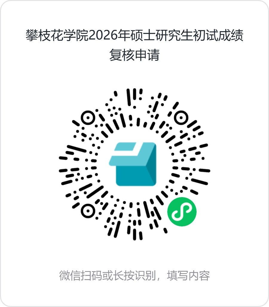 微信扫描下方二维码,如实填写“攀枝花学院2026年硕士研究生初试成绩复核申请”,仔细阅读填写说明,并按要求完整填报成绩复核申请表单(请勿多次重复提交)。不接受现场、电话等申请,未在规定时间内申请或资料不完整者不予以受理。
